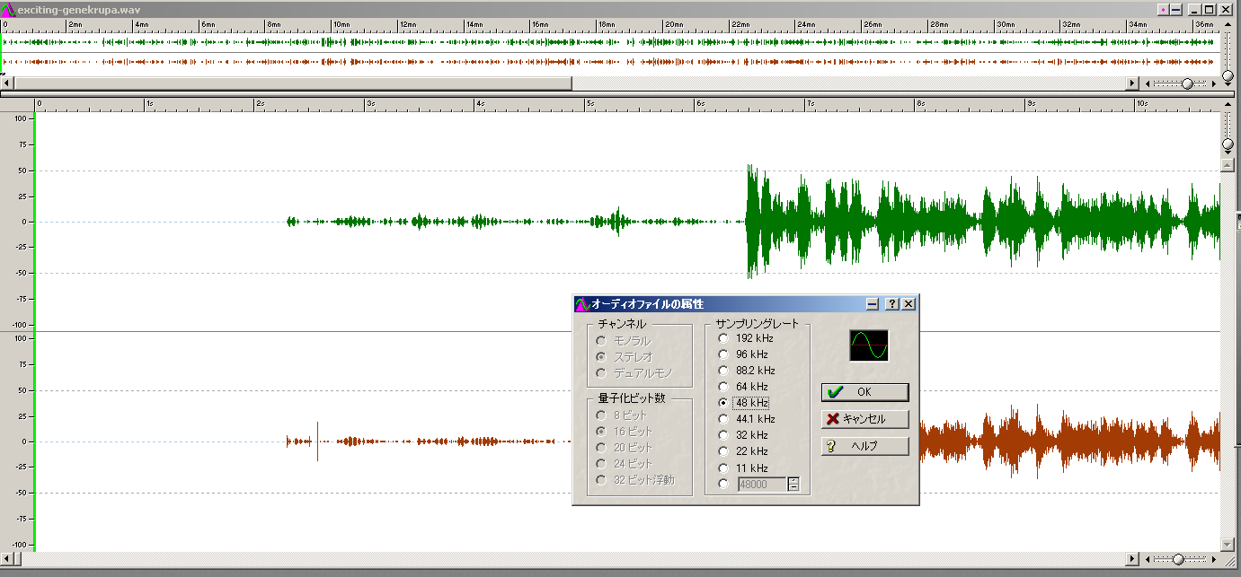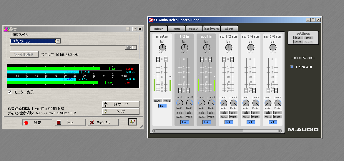 ドライバを入れてDATとカードのSPDIFを接続しました。SPDIFを通してダイレクトに録音されるWAVファイルは、私のDATのSPモードと同じ16bit 48KHzになります。CDよりも多少高いサンプリングレートですが、最終的にはCDに収めるわけですから、残念ながら後ほど16bit 44.1KHzに落すことになりますね。2枚目の左はWaveLab LiteというソフトでWAVファイル録音中、右はこのたびインストールしたサウンドカードのミキサー画面。