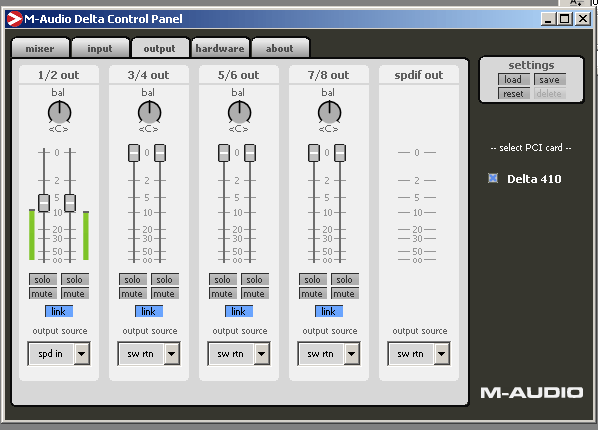 OUTのミキサー画面。1/2のoutput sourceのところがspd in (SPDIF IN)になっていますね。この1/2というのは8個あるアナログOUTのうちの1と2(ステレオなので)のことで、これで遥々DATからやってきたデジタル信号を、下の記事のサウンドカードのD/Aコンバータを介して聞ける状態。