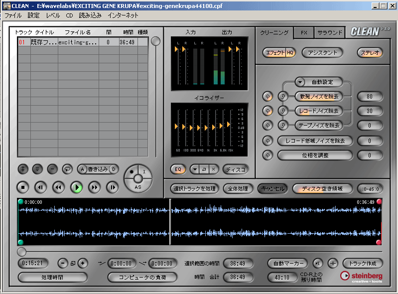 録音したファイルは単一なので曲ごとにカット。これやらないとCDにしたときも単一の1曲扱いで選曲できませんね。ライブなど曲間で音声が途切れるとおかしなことになるものは、CDライティングソフト上でプレギャップ・ゼロみたいなオプションで焼かないと途切れてしまいますね。