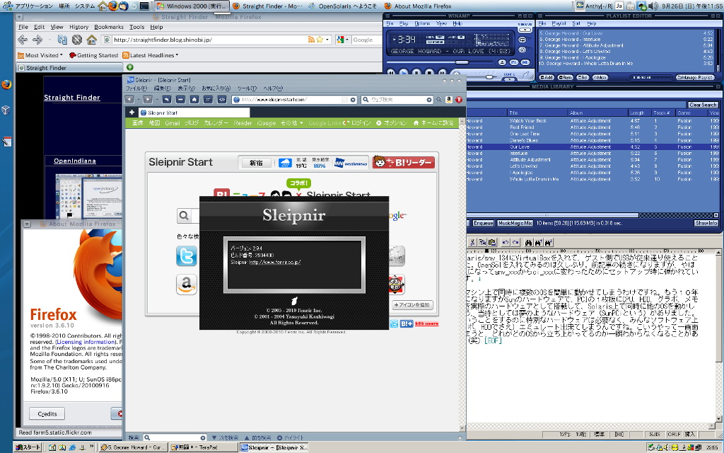 最近は1つのマシン上で同時に複数のOSを簡単に動かせてしまうわけですね。10年くらい前の話になりますが、Sunのハードウェアで、PCIの1枚板にCPU、HDD、グラボ、メモリなど一式を実際のハードウェアとして搭載して、Solaris上で同時に他のOSを動かしてしまうという、当時としては夢のようなモノ(SunPCiという)がありました。今では、こういうことをするのに特別なハードウェアは必要なく、みんなソフトウェア上で(CPUやグラボ、HDDでさえ)エミュレート出来てしまうんですね。こうやって一画面上に並べてしまうと、どれがどのOSから立ち上がってるのか一瞬わからなくなる、